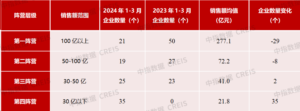 表:2024年1-3月TOP100房企各阵营数量及销售额均值情况
