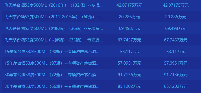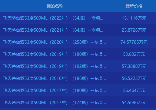 其中,30年茅台酒的挂牌转让价值较高,72瓶30年茅台酒的挂牌转让价约91.71万元,单瓶价格约为1.27万元;66瓶30年茅台酒的挂牌转让价达85.12万元,单瓶价格约为1.29万元。