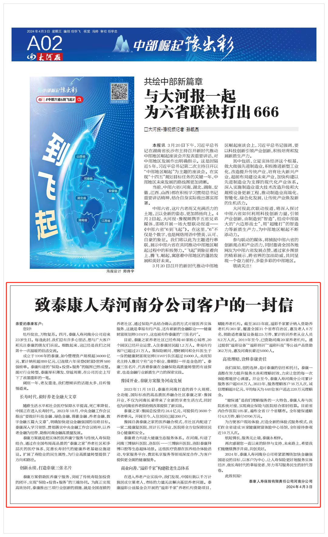2024年,泰康人寿河南分公司将紧紧围绕加快金融强国建设的目标,以客户为中心,让人寿保险更好地服务实体经济,做长寿时代的幸福使者,努力书写服务民生的时代答卷。