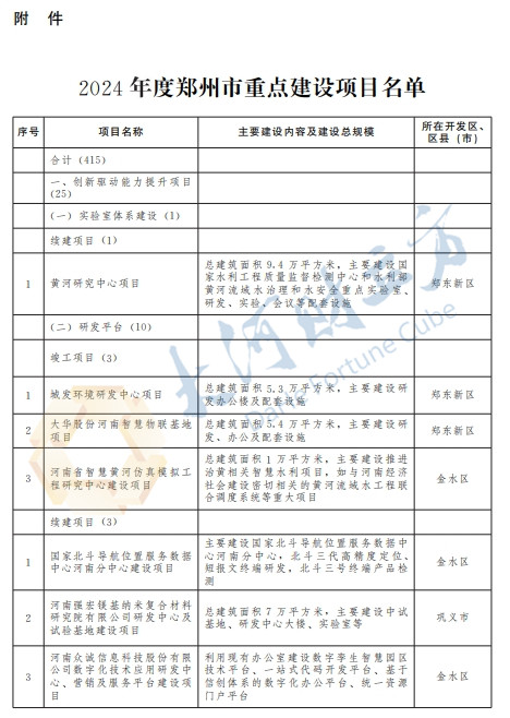 【大河财立方消息】4月4日,郑州市人民政府印发2024年郑州市重点建设项目名单的通知,名单共列项目415个,总投资3556.9亿元,2024年计划完成投资1127.9亿元。