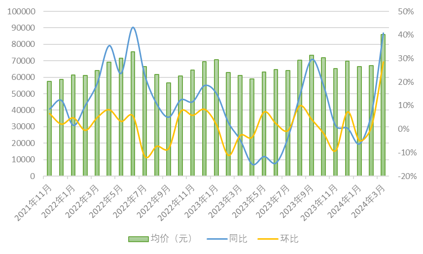 受高端住宅入市的影响,供应金额和均价的同环比均出现显著增长。3月,新增供应的套均总价超过千万级别。