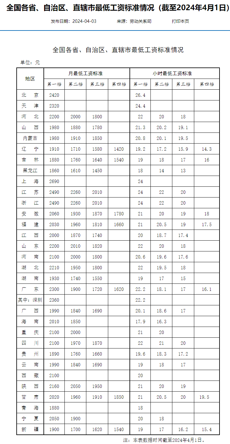 【大河财立方消息】4月7日消息,人社部网站日前公布了全国各省、自治区、直辖市最低工资标准情况(截至2024年4月1日)。