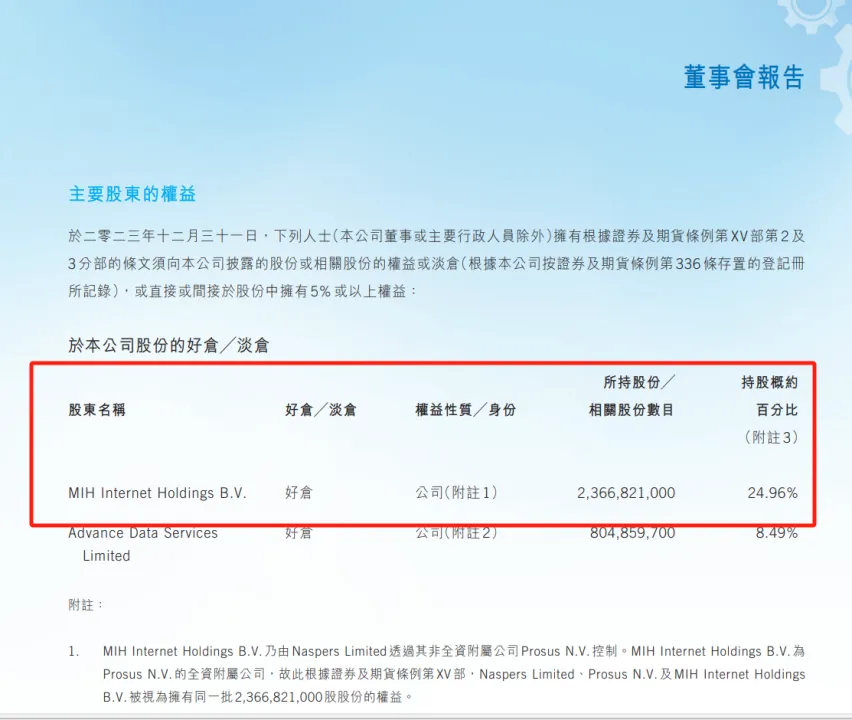 腾讯2023年年报披露,截至2023年末,南非大股东Naspers Limited 透过其非全资附属公司 Prosus N.V. 控制的MIH Internet Holdings B.V. 持有腾讯23.67亿股,持股比例为24.96%。