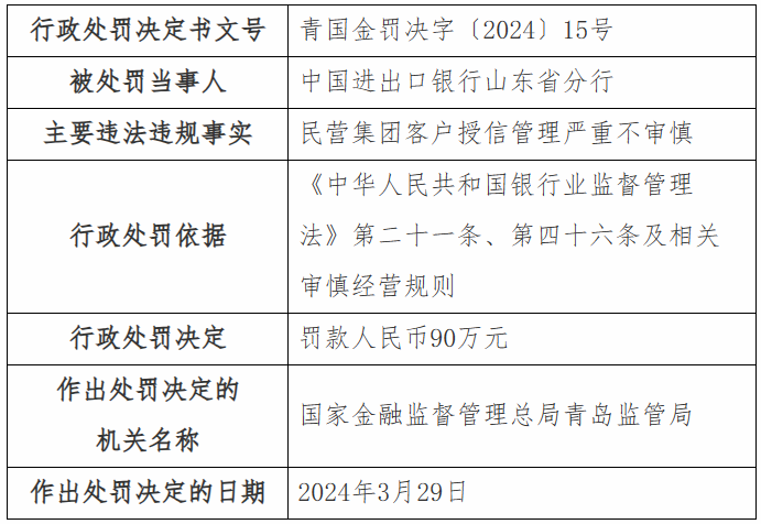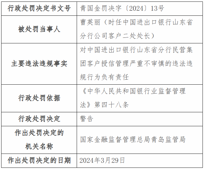 【大河财立方消息】4月9日消息,中国进出口银行山东省分行因民营集团客户授信管理严重不审慎,日前被国家金融监督管理总局青岛监管局处罚款90万元。时任中国进出口银行山东省分行公司客户二处处长曹英丽对此负有责任,被予以警告。