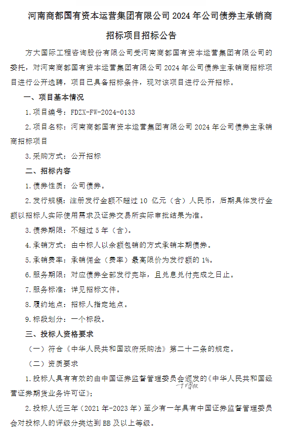 【大河财立方消息】4月10日消息,河南商都国有资本运营集团就2024年公司债券主承销商项目进行公开招标。