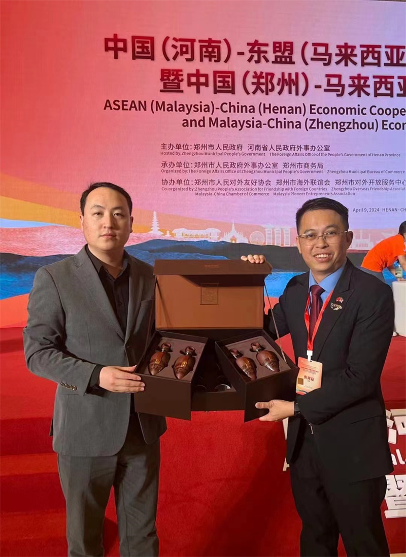 4月9日,2024中国(河南)一东盟人文交流月活动开幕,“仰韶彩陶坊太阳”文创礼盒作为河南厚礼赠予马来西亚国家旅游局副局长李泰康,向国际贵宾充分展示中国白酒源远流长的历史文化和仰韶高端文化白酒品牌背后的文化传承和品牌内涵,在传递中华厚重文化的同时讲好中国故事。