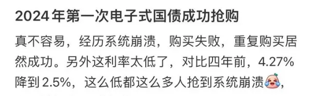 根据媒体报道,作为今年首轮发行的电子式国债,手速慢的投资者根本抢不到,不少营业网点额度在半小时内就已售罄。