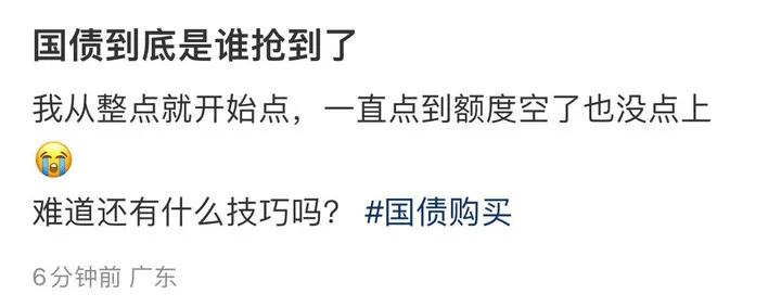 据扬州日报报道,不少市民向记者表示,即使定了闹钟准备早上起来抢买国债,也仍然没有抢到。“手机上购买国债确实挺方便的,但是要‘拼手速’。我定了早上8点30分的闹钟想买国债,结果打开手机一看,已经没有额度了。”