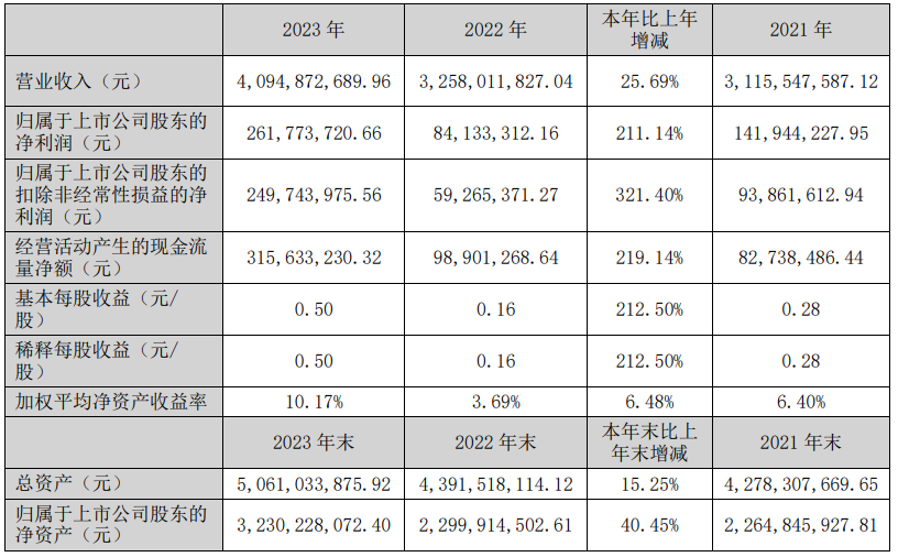 2023年,飞龙股份实现营业收入40.95亿元,同比增长25.69%;实现归母净利润2.62亿元,同比增长211.14%;扣非净利润2.50亿元,同比增长321.40%。