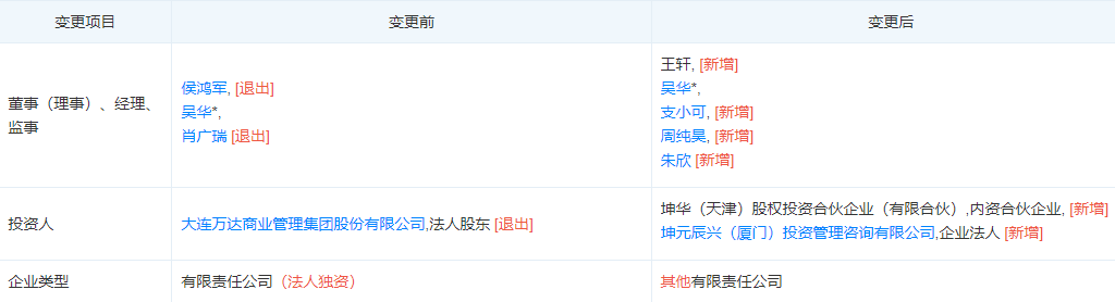 【大河财立方消息】大河财立方记者了解到,近日,北京万达广场实业有限公司发生工商变更,原全资股东大连万达商业管理集团股份有限公司退出,新增股东坤华(天津)股权投资合伙企业(有限合伙),持股99.99%,坤元辰兴(厦门)投资管理咨询有限公司,持股0.01%。
