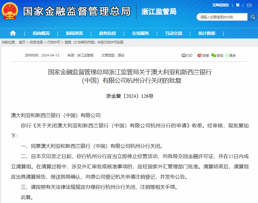 批复提到,澳大利亚和新西兰银行(中国)有限公司杭州分行应当立即停止经营活动,交回金融许可证,并在15日内成立清算组。