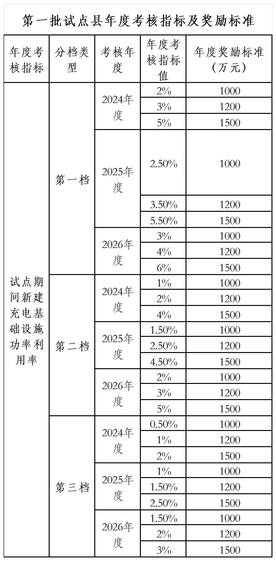中央财政对经三部门同意备案且完成任务目标的试点县给予奖励资金支持,每个试点县示范期为3年。奖励标准根据每年度试点县充换电设施功率利用率达标情况设置,共分为三个档次。示范期内,每年均达到最高目标的试点县最多可获得4500万元(具体年度考核指标及奖励标准见附件3)。