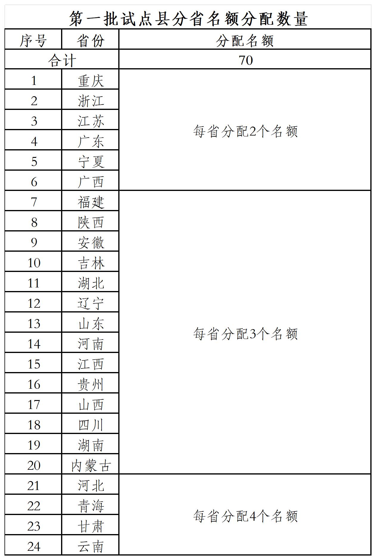(三)名额分配。2024—2026年,三部门根据地方当前新能源汽车和公共充换电基础设施发展状况及未来潜力、地域面积、省内县(县级市)数量、当前财力状况等因素分配省级试点县名额(见附件2)。