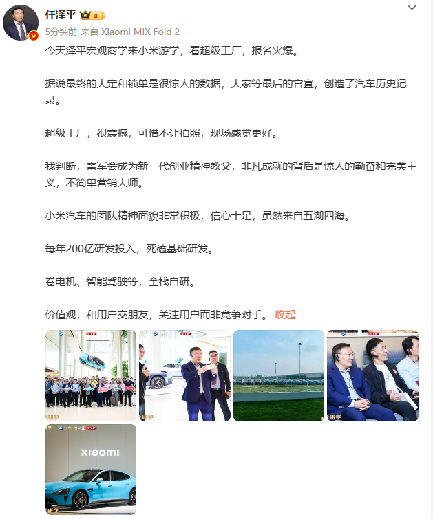 【大河财立方消息】4月13日,任泽平在社交媒体上发文称:“今天泽平宏观商学来小米游学,看超级工厂,报名火爆。据说最终的大定和锁单是很惊人的数据,大家等最后的官宣,创造了汽车历史记录。”