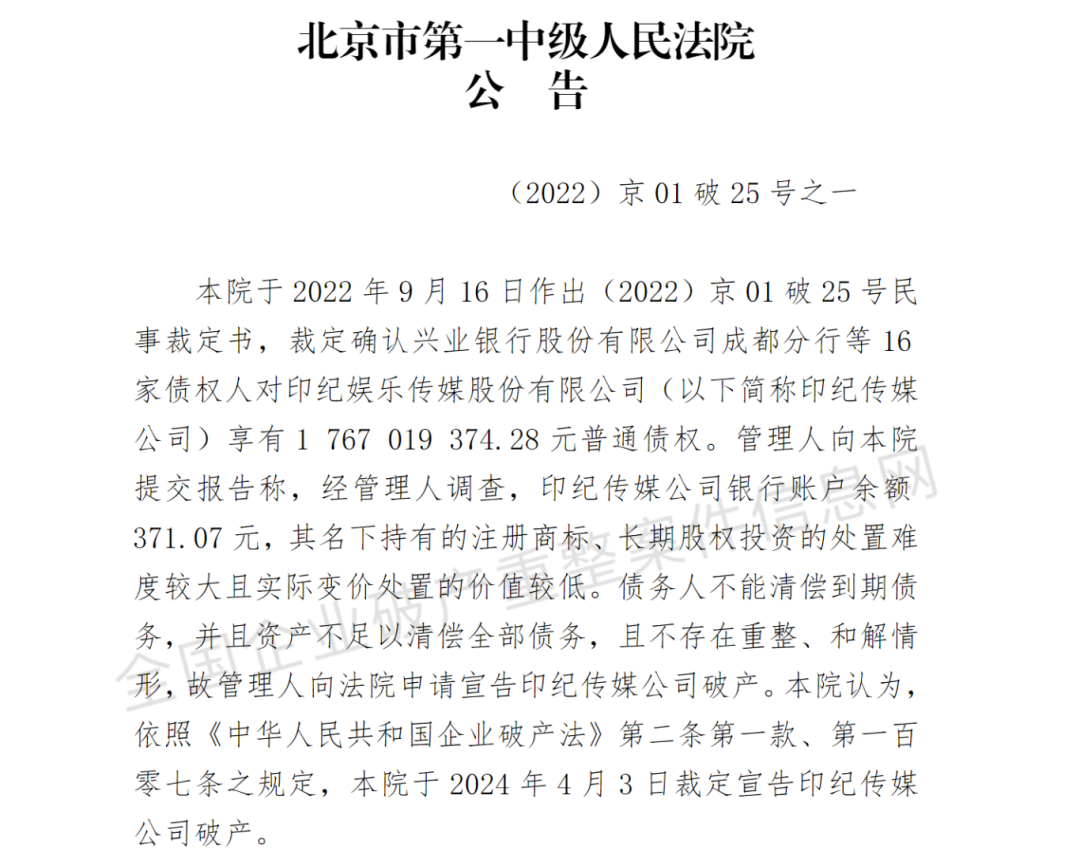 2024年4月3日,北京市第一中级人民法院正式宣告印纪传媒公司破产。