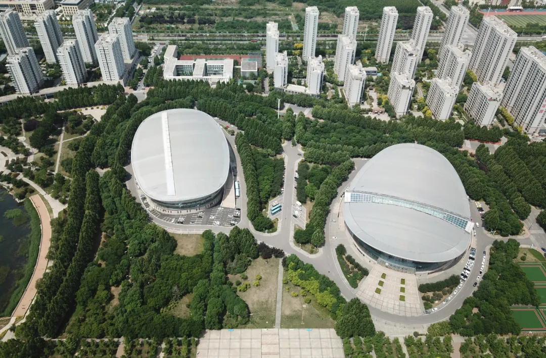 位于淄博市张店区的淄博市体育中心综合体育馆(右)和游泳馆(无人机照片)。徐速绘摄(新华社)