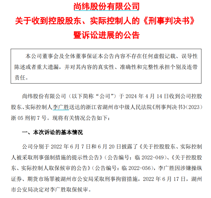 2022年6月7日,尚纬股份公告,李广胜因涉嫌操纵证券、期货市场罪被湖州市公安局采取刑事拘留措施,同年6月17日,湖州市公安局决定对李广胜取保候审。