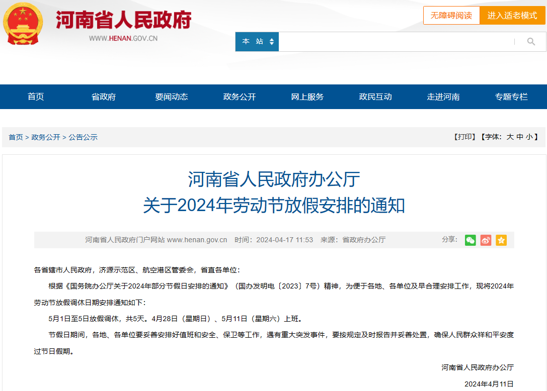 4月17日消息,河南省人民政府办公厅日前发布关于2024年劳动节放假安排的通知。