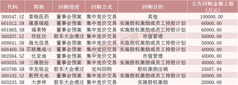 此外,还有300多家上市公司公布了股份回购预案,但尚未实施回购,拟回购金额上限合计近140亿元。其中,泰格医药拟回购金额上限为10亿元,隆基绿能、福莱特均为6亿元,欣旺达、海光信息均为5亿元。
