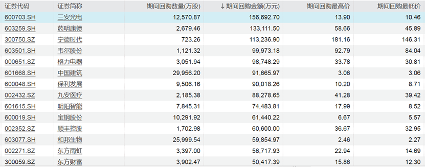 在今年以来实施回购的公司中,三安光电、药明康德、宁德时代回购金额均在10亿元以上,韦尔股份、格力电器、中国建筑、保利发展回购金额均逾9亿元,九安医疗回购金额近9亿元。包括上述8家上市公司在内,今年以来有14家上市公司回购金额超过5亿元。