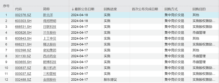 4月17日,得邦照明和新北洋发布关于实施回购的公告。得邦照明公告称,4月17日,公司通过集中竞价交易方式首次回购股份230240股,支付的总金额为 278.47 万元(不含印花税、交易佣金等交易费用)。