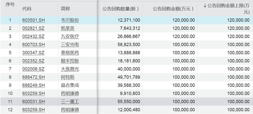 从公告回购金额上限情况看,韦尔股份、凯莱英、九安医疗回购金额上限均为12亿元,泰格医药、顺丰控股、大族激光等多股回购金额上限为10亿元。值得注意的是,药明康德两次发布回购金额上限在10亿元的回购预案,合计20亿元。
