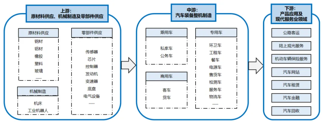 汽车行业产业链长、涉及面广、带动性强,从产业链条来看,上游包括原材料供应、机械制造和零部件供应等。其中原材料主要是钢材铝材、橡胶、塑料、玻璃等;机械制造主要是指机床、工业机器人等;零部件供应分类较多,可分为电子元器件、发动机、变速器等汽车零部件和配件;中游包括汽车整机制造是产业链关键核心环节。汽车制造商将从上游供应链中获得的零部件和配件组装成整车。下游主要为对汽车装备产品有需求的行业,如公路客运、非铁路陆上观光服务、机动车辆保险服务、汽车网站,以及汽车整机产品营销(租赁)、服务支持(维修、翻新、提供实施解决方案)、产品再制造等现代服务业领域。