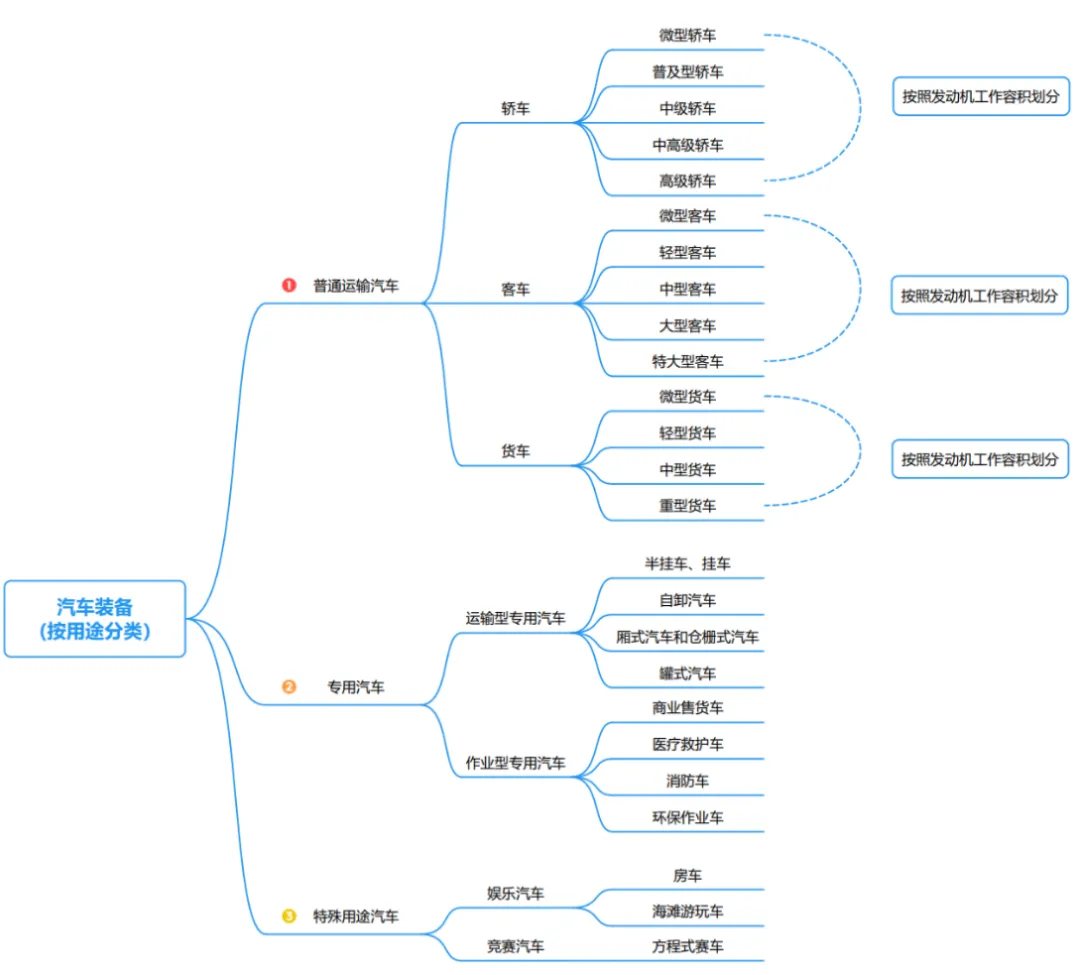 通常按照应用场景(用途)将汽车分为普通运输汽车、专用汽车、特殊用途汽车三大板块。其中,普通运输汽车包括微型轿车、普及型轿车、中高级轿车、高级轿车、微型客车、轻型客车、大型客车、微型货车、中型货车、重型货车等;专用汽车包括集装箱车、半挂车、商业售货车、医疗救护车、消防车等;特殊用途车辆包括房车、赛车等。