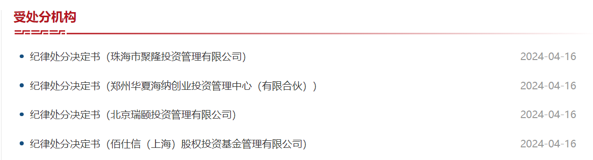 珠海市聚隆投资管理有限公司(以下简称“聚隆投资”)、郑州华夏海纳创业投资管理中心(有限合伙)(以下简称“华夏海纳”)、北京瑞颐投资管理有限公司(以下简称“北京瑞颐”)和佰仕信(上海)股权投资基金管理有限公司(以下简称“佰仕信”)4家私募基金管理人,及9名高管人员受到相应处罚。