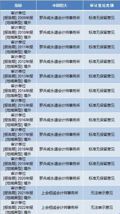 公开资料显示,中国恒大自2009年在香港上市后,审计机构一直为普华永道,合作时间长达14年直到2023年1月。与此同时,对于恒大2009年至2020年的年报,普华永道均出具了标准无保留意见。