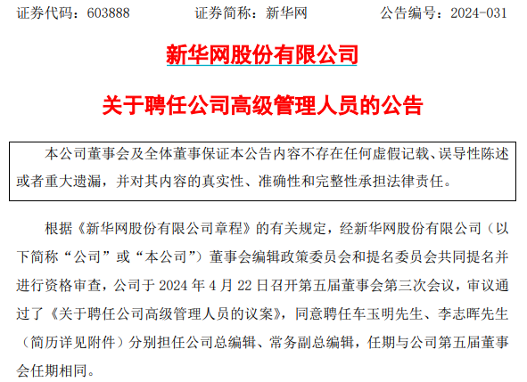 【大河财立方消息】4月22日,新华网股份有限公司(证券简称:新华网)发布公告称,董事会召开会议,审议通过了有关议案,同意聘任车玉明、李志晖分别担任总编辑、常务副总编辑。