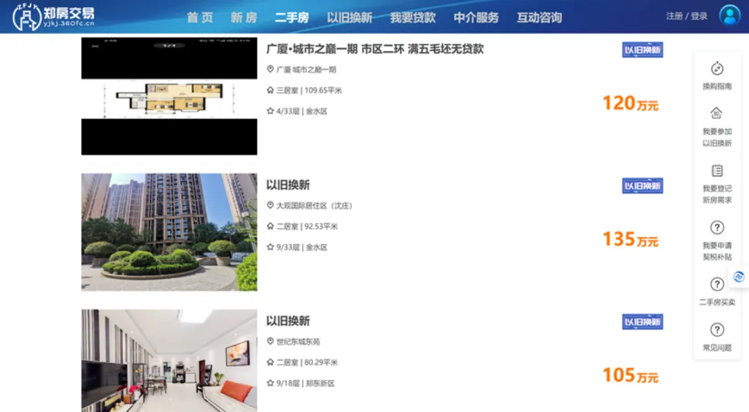 此外,在“郑州市房产交易服务平台”上,记者看到,二手房挂牌、新房查询、契税补贴申请等均能一站式完成。有换房需求的购房者可在平台上登记二手房房源信息,经核验后录入城发安居公司待收购二手住房房源库,同时,房地产开发企业可填报在售项目信息和优惠信息,经筛选后录入“以旧换新”商品住房房源库。换房者可通过大数据筛选,快速锁定意向房源。