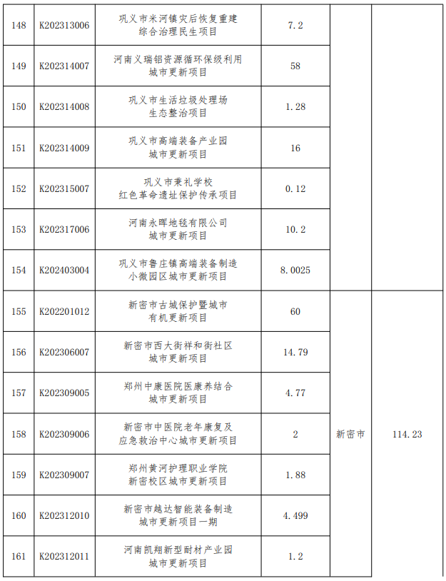 中原区早期人防工程地下空间综合整治利用项目,二七区碧波园文化艺术广场项目,管城区2022年老旧小区综合改造提升项目,郑东新区五洲农贸市场城市更新项目,巩义市数字商务中心城市更新项目,新密市新华路办事处2023年老旧小区综合改造工程,新郑市新印、人行、医药公司家属院区域城市更新项目,中牟县2022年老旧小区改造项目等8个项目已竣工,调整出城市更新项目库。