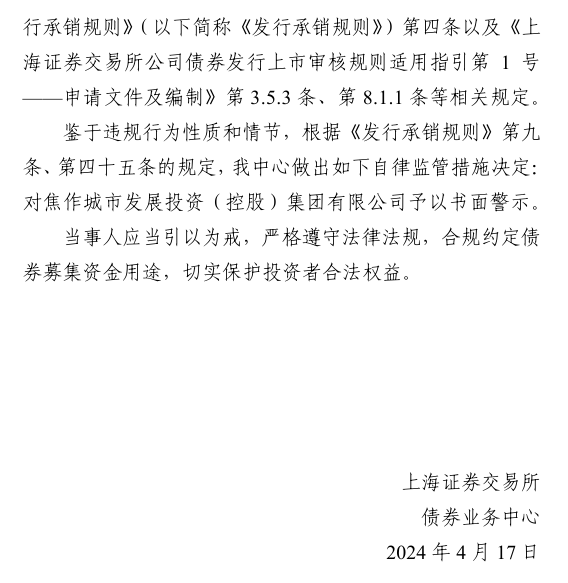 鉴于违规行为性质和情节,根据《发行承销规则》第九条、第四十五条的规定,上海证券交易所债券业务中心做出如下自律监管措施决定:对焦作城市发展投资(控股)集团有限公司予以书面警示。
