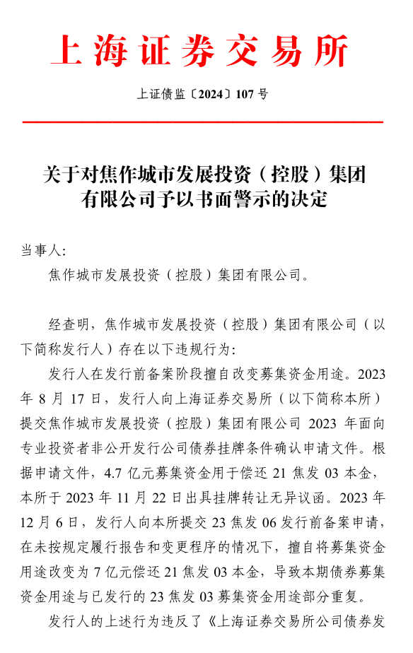 2023年12月6日,焦作城发投向上交所提交“23焦发06”发行前备案申请,在未按规定履行报告和变更程序的情况下,擅自将募集资金用途改变为7亿元偿还“21焦发03”本金,导致本期债券募集资金用途与已发行的“23焦发03”募集资金用途部分重复。