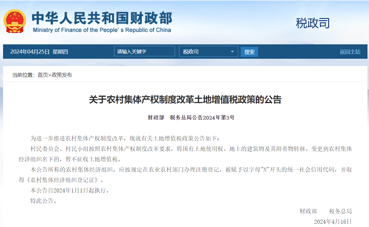 【大河财立方消息】4月25日消息,财政部、国家税务总局日前发布关于农村集体产权制度改革土地增值税政策的公告。其中提到,村民委员会、村民小组按照农村集体产权制度改革要求,将国有土地使用权、地上的建筑物及其附着物转移、变更到农村集体经济组织名下的,暂不征收土地增值税。