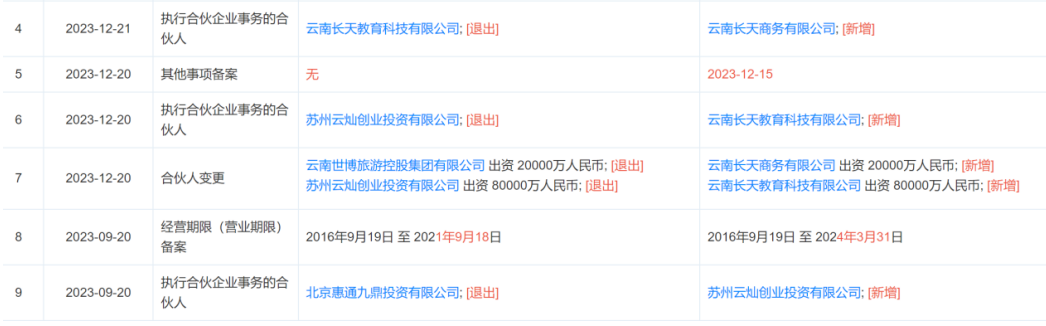股权明细发现,云南世博集团由华侨城持股51%、云南国资委持股49%。值得注意的是,2023年12月,在九鼎投资转让世博旅游股份的同时,云南世博集团将持有世博旅游20%股份转让给了云南长天商务有限公司。