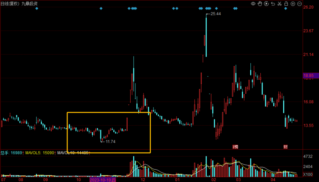 在2023年四季度至2024年一季度期间,九鼎投资股价最高涨幅超1倍。