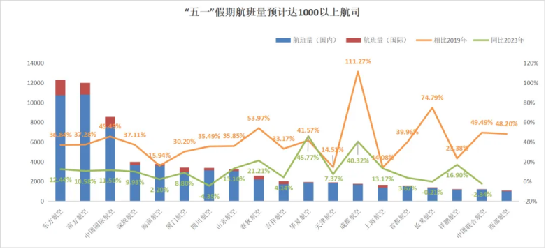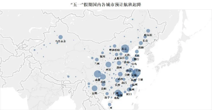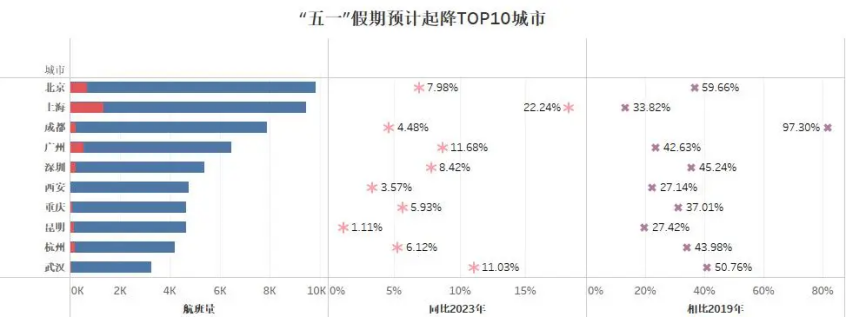 根据分析,今年“五一”假期境内机场日均起降3万架次,预计会成为史上最忙“五一”;全国39个城市航班起降超1000架次,六成以上城市起降超2019年同期;19家航司航班量超1000架次,东航航班量排名第一;国内京沪航线最繁忙,国际及地区航线TOP10上海占6条。