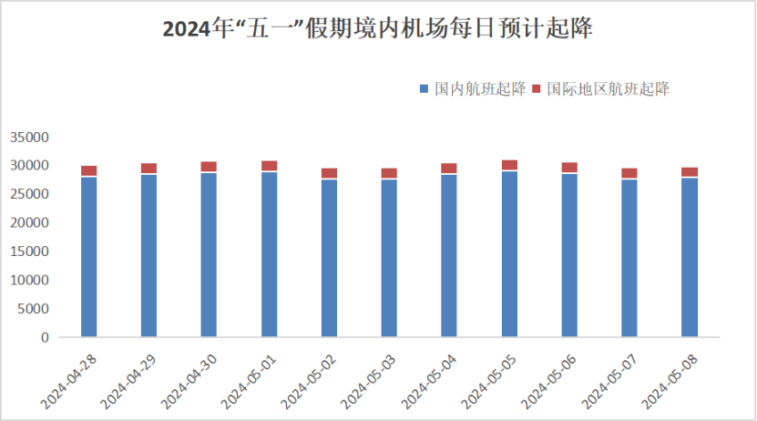 根据境内机场每日起降架次计算,接近假期时起降架次开始增长,假期中间的5月2日、5月3日有所下降,之后再次增长,假期结束后起降架次逐步回落。假期最后一天的5月5日是起降最高峰,境内机场共起降31010架次。