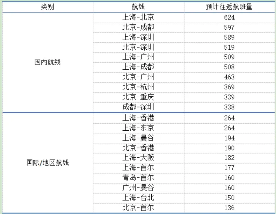 其中,上海-北京往返预计达到624班次,成为最繁忙航线。北京-成都、上海-深圳分列第二、三位。