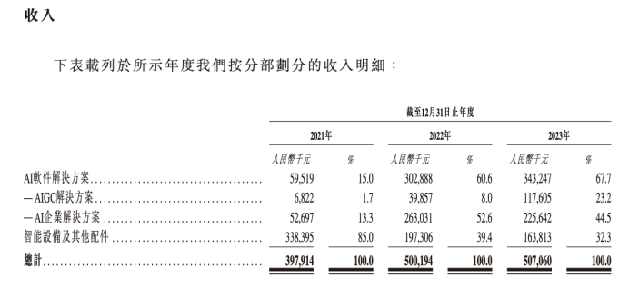 根据出门问问招股书,AI企业解决方案是公司主要营收来源,且较为依赖单一客户,单一客户营收曾在2022年占到公司总营收的42.6%。2022年,因AIGC解决方案付费用户增加,营收从2022年的3985.7万元增至2023年的1.18亿元,占总营收比重才从8%提升至23.2%。