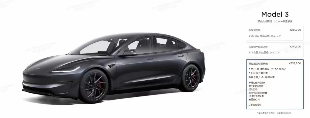 新款Model 3高性能全轮驱动版拥有623公里续航里程 (CLTC 预估)、3.1 秒百公里加速、261公里/小时最高车速、专属性能外观设计、高性能动力总成、运动座椅、连续可变阻尼减振器、19英寸曲速轮毂、赛道模式V3。