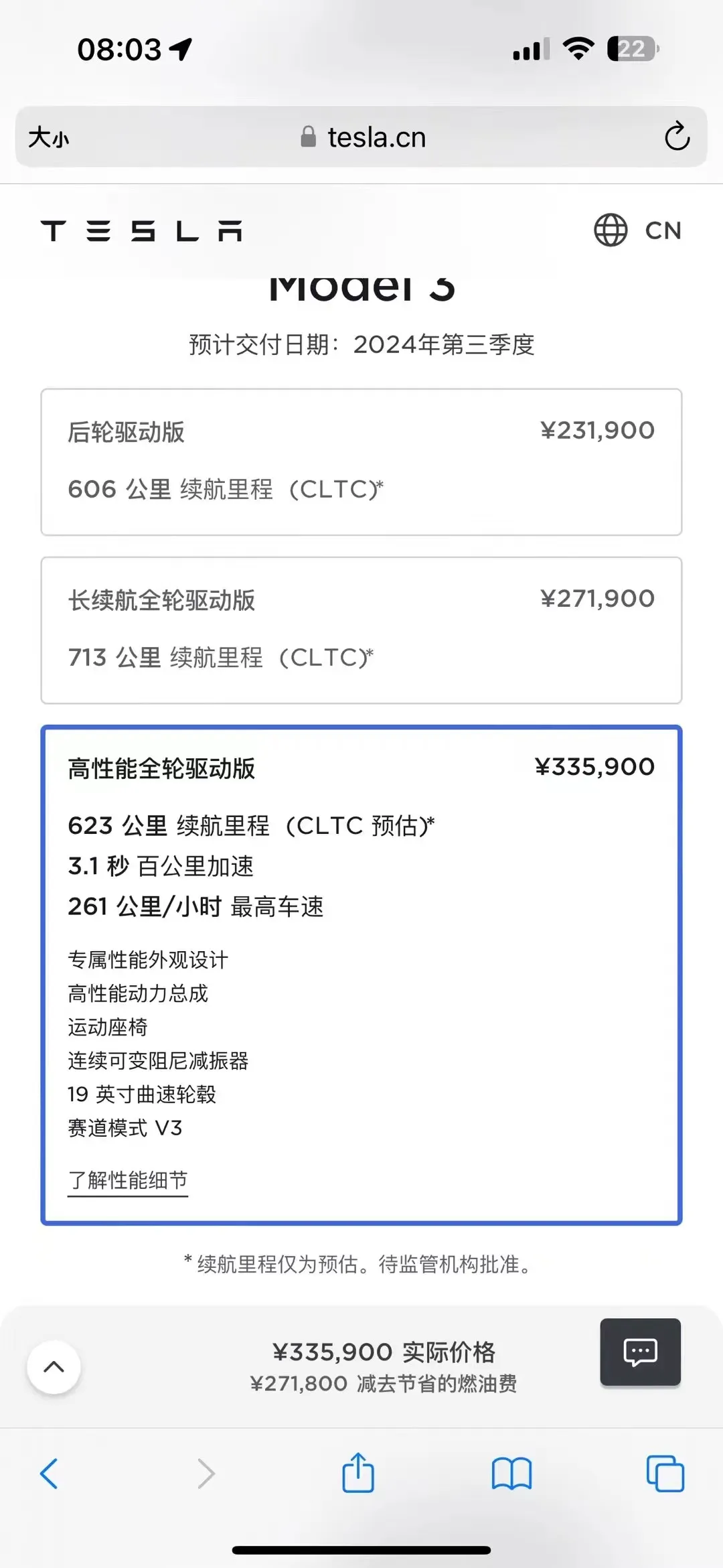4月24日,特斯拉中国官网上线新款Model 3高性能全轮驱动版,售价33.59万元起,预计第三季度开始交付。