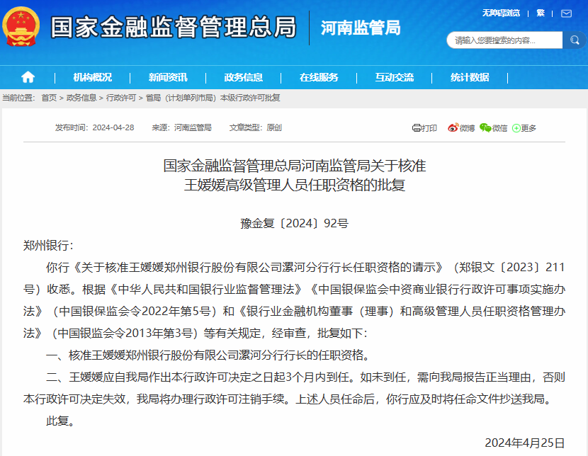 国家金融监督管理总局河南监管局日前核准了王媛媛郑州银行股份有限公司漯河分行行长的任职资格
