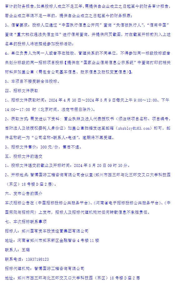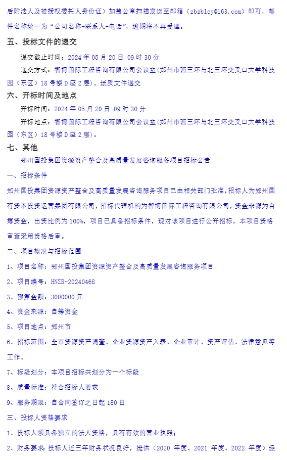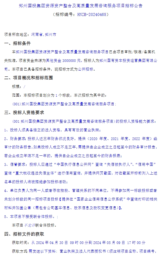 【大河财立方消息】4月29日,郑州国有资本投资运营集团公告,就集团资源资产整合及高质量发展咨询服务项目公开招标。