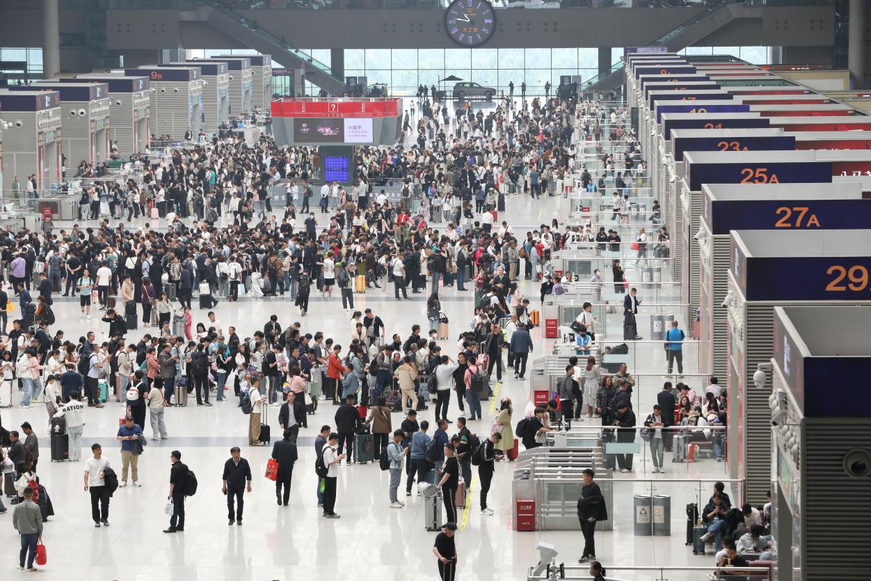 根据车票预售情况来看,今天,国铁集团郑州局预计发送旅客57.1万人,同比2023年铁路“五一”假期运输首日(2023年4月27日)增长11.9%。
