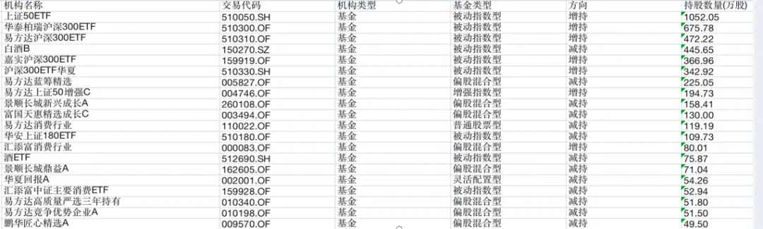 Wind数据显示,截至一季度末,持有贵州茅台股份数最多的公募基金为上证50ETF,持有1052.05万股贵州茅台,一季度增持281.17万股。华泰柏瑞沪深300ETF、易方达沪深300ETF、白酒B、嘉实沪深300ETF等也持有较多的贵州茅台。