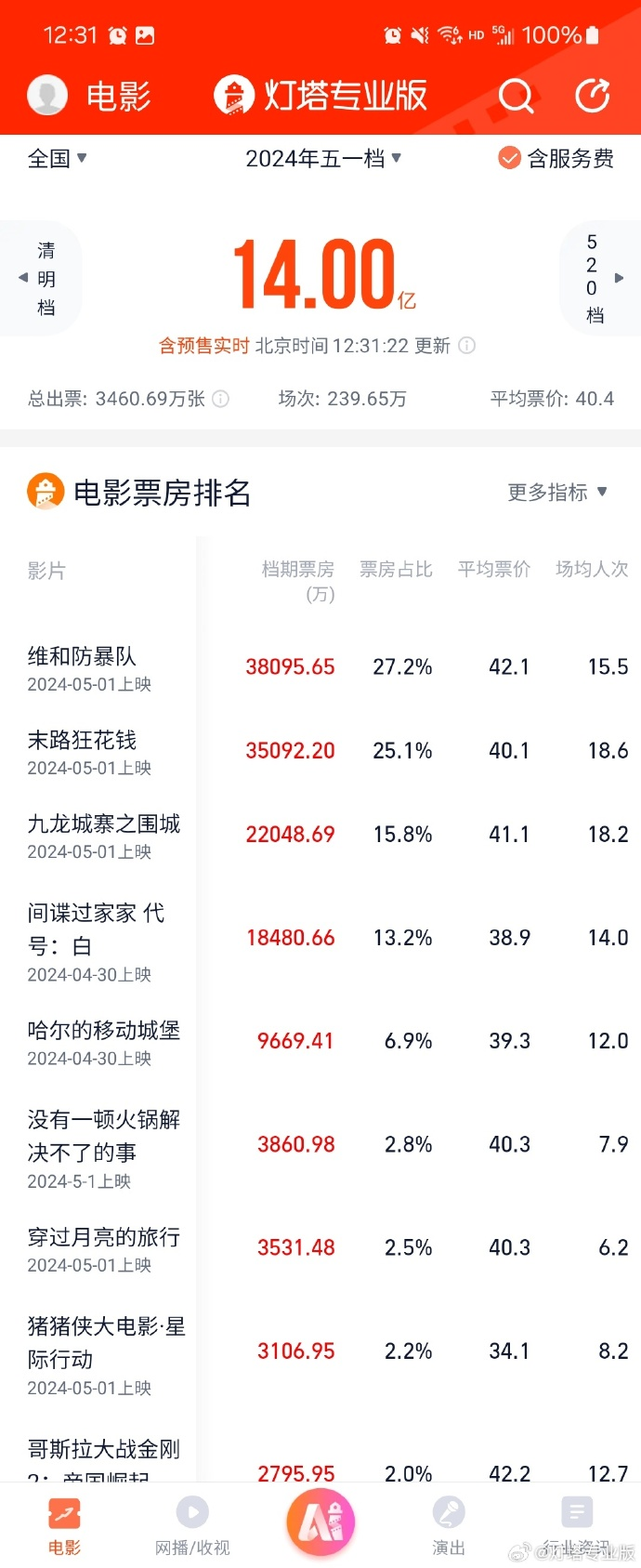 【大河财立方消息】据灯塔专业版,截至5月5日12时31分,2024五一档(5月1日-5月5日)档期内票房已突破14亿!《维和防暴队》《末路狂花钱》《九龙城寨之围城》暂列当前档期内票房前三位。