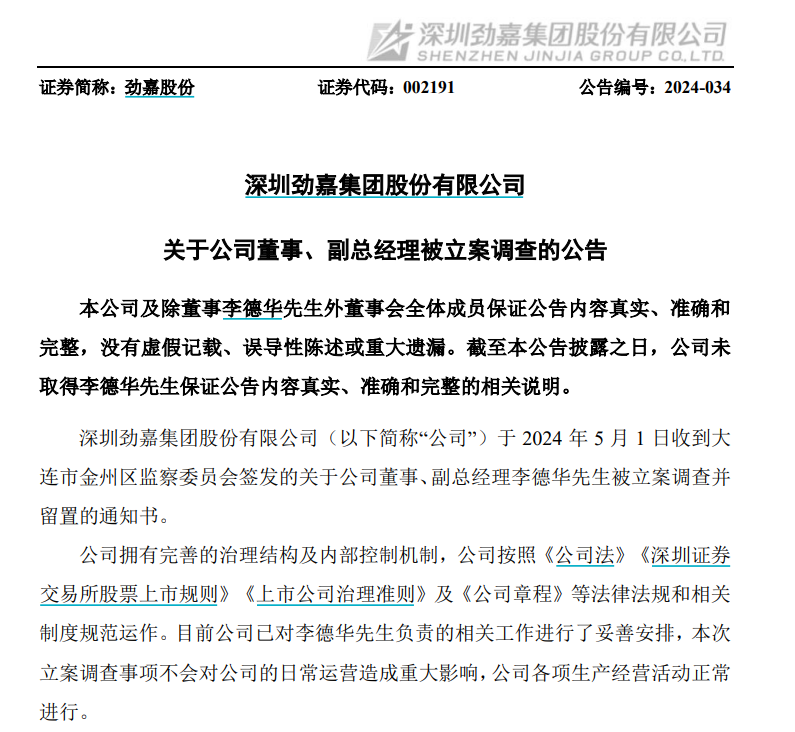 【大河财立方消息】5月5日,劲嘉股份(002191.SZ)公告,公司于5月1日收到大连市金州区监察委员会签发的关于公司董事、副总经理李德华被立案调查并留置的通知书。